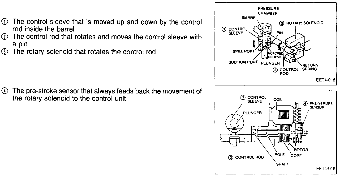 On the other hand, when the control sleeve is at the bottom, the pre-stroke is at its minimum, and as the plunger lift speed is slow, the fuel feed time is longer. This means that the amount of fuel fed per unit time is smaller and the fuel feed rate is lower.