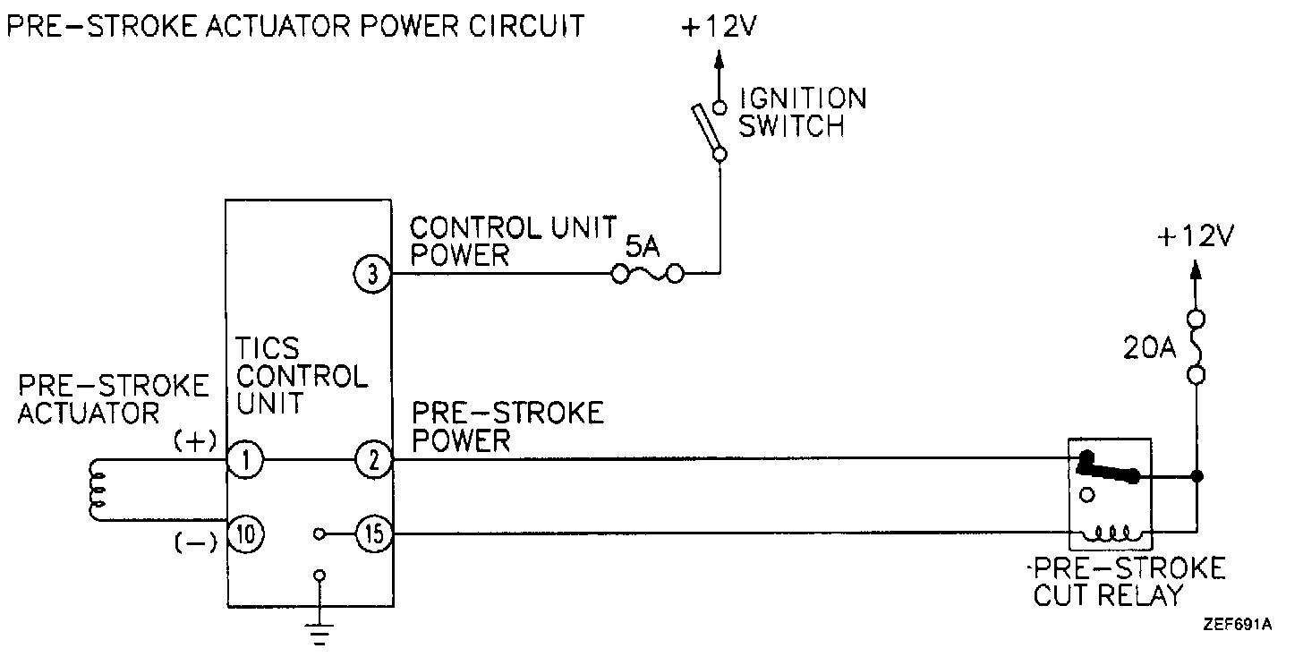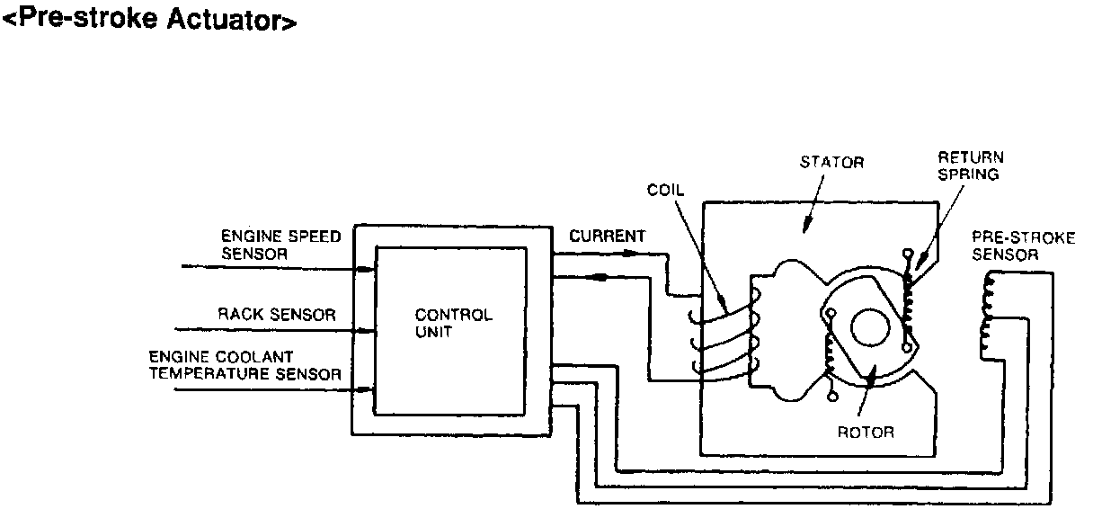 The power source for the pre-stroke actuator has a separate circuit. If there is any abnormality in the pre-stroke servo system, this circuit functions to stop the control, and at the same time it opens the pre-stroke cut relay to cut the power for the pre-stroke actuator.