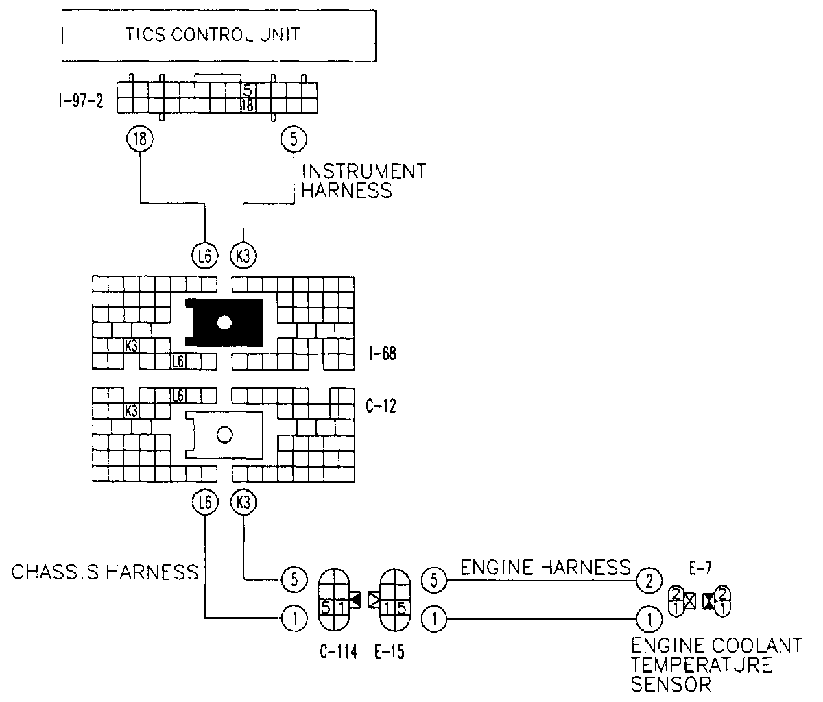1. Check for continuity, short circuit, and insulation between instrument harness connector [I-97-2] and harness connector [E-7] of the engine coolant temperature sensor.