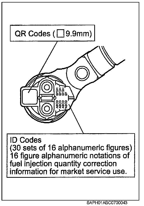 1. QR (Quick Response) codes displaying various injector characteristics and the ID codes showing these in numeric form (30 alphanumeric figures) are engraved on the injector head.