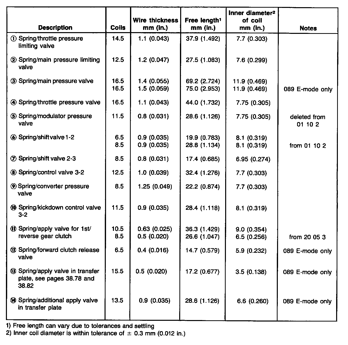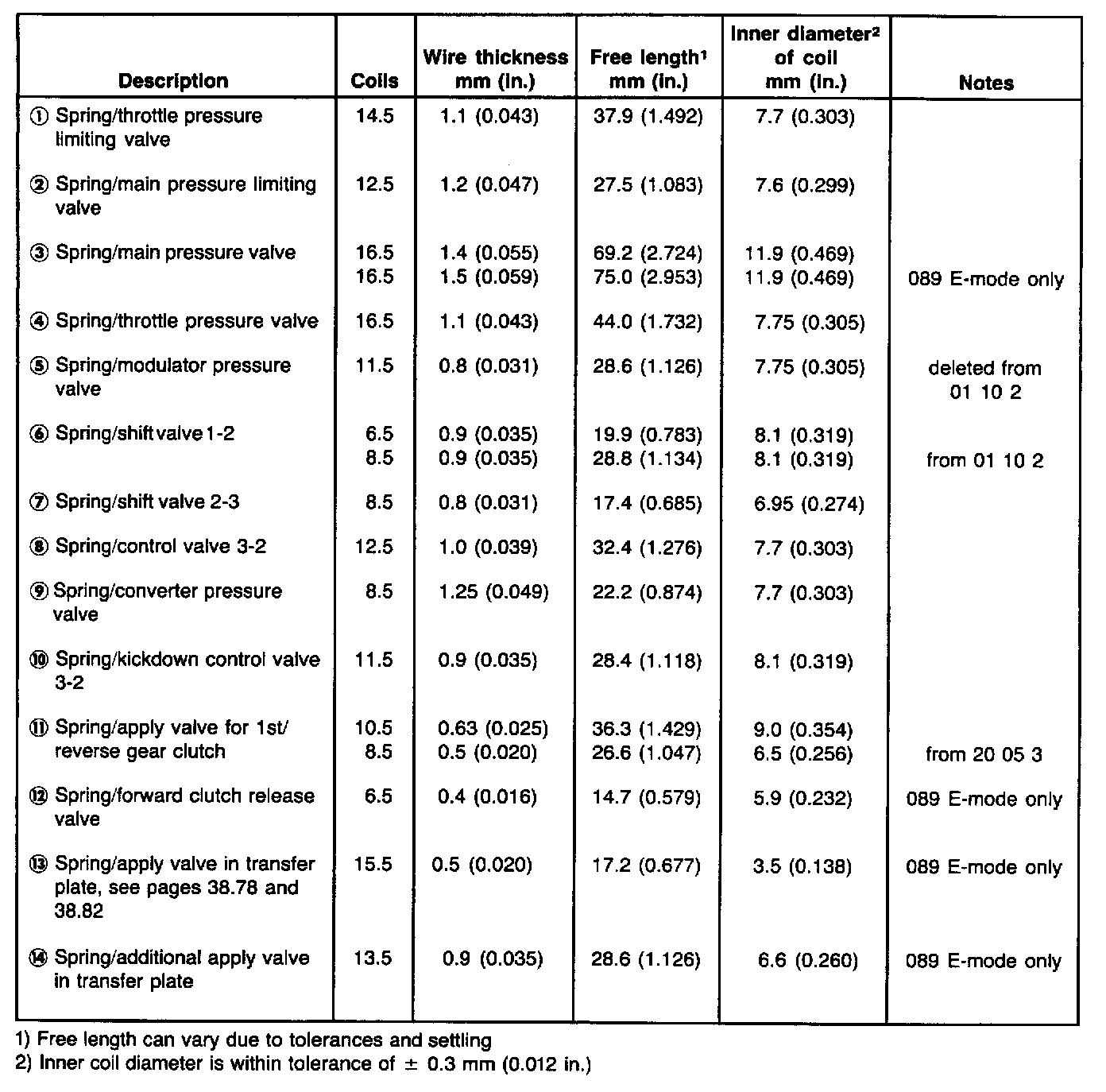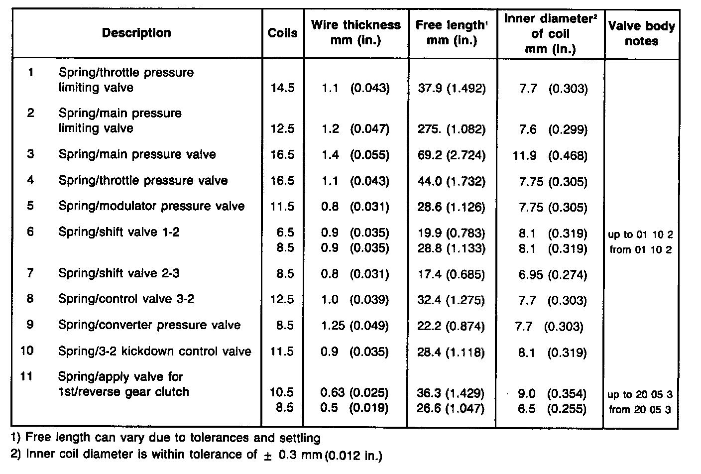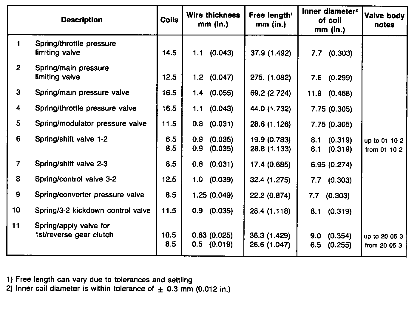 This table allows identification of springs by their dimensions. Coil diameter and free length can vary between new and used springs (due to settling) so check spring wire thickness and number of coils first, as means of identifying spring. If this is not enough also use inner coil diameter and free length
