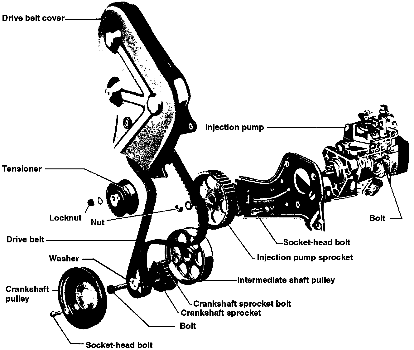 If special pin 2064 fits easily into the holes in the pump sprocket and in the pump mounting bracket, the camshaft drive belt is correctly and accurately installed and the valve timing is correct.