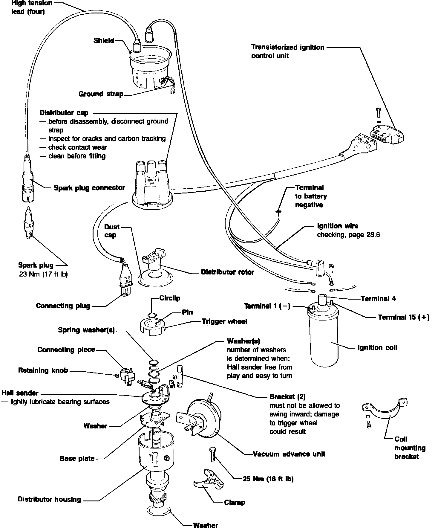 This system consists of a Hall generator in the distributor, electronic control unit, idle stabilizer (on California models), specially calibrated secondary ignition components, and related wiring.