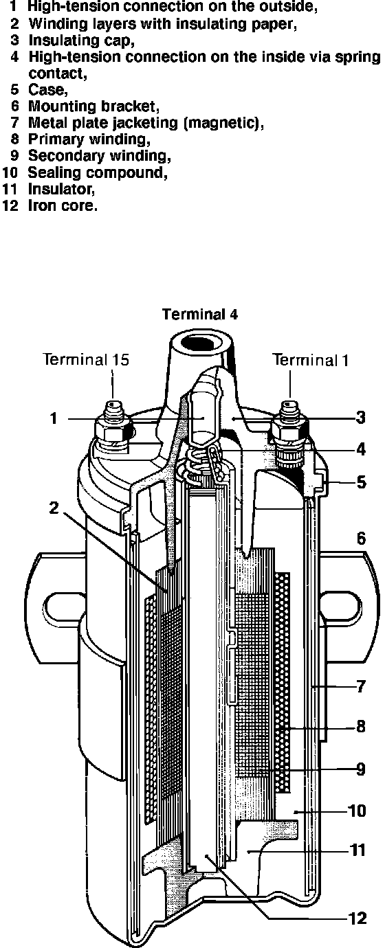 The ignition coil, Fig. 2, consists of a metal housing which accommodates metal plate jackets for reducing stray magnetic fields. The secondary winding is wound directly onto the laminated iron core and connected electrically to the center tower in the cap of the ignition coil via the core. Since the high tension is applied to the iron core, the core must be insulated by the cap and an additional insulator inserted in the base. The primary winding is located near to the outside around the secondary winding. The insulated ignition cap contains the terminals for the battery voltage and the connection to the contact breaker, symmetrically with the high tension tower. The windings are insulated and mechanically locked in position by potting with asphalt. Oil filled ignition coils are also available. The heat is dissipated through the metal plate jackets to the can.