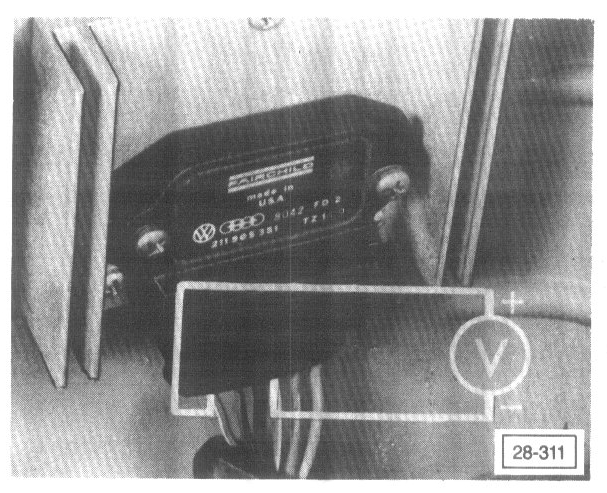 - connect + (plus) wire of voltmeter (VAG 1315A or equivalent) to terminal 6 and - (minus) wire to terminal 3