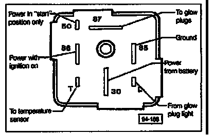 Fig. 6-3 is a rear view of the glow plug relay used on the diesel models covered by this manual. The numbers shown appear on the back of the relay and are used to identify the terminals. In the procedures which follow, these numbers are also used in reference to the corresponding terminals on the fuse/relay panel.