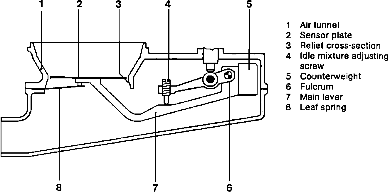 The air flow sensor is mounted in the intake air stream between the air cleaner and throttle body. The unit consists of an air flow sensor flap and venturi funnel. The air flow sensor plate is mechanically connected to the control plunger, causing the plunger to rise and fall in direct relation to the amount of air entering the engine. Air/fuel mixtures are also tailored to engine operating conditions by the venturi shape of the cone in which the air flow sensor plate operates. At idle, when air flow volume is relatively low, the cone shape increases pressure under the sensor plate, providing additional lift to richen air/fuel mixtures. At part throttle the cone design causes the sensor plate to float lower than air flow through a straight sided cone would dictate, providing leaner mixtures for improved economy. During full throttle operation the venturi shape increases air velocity, providing additional lift to the sensor plate and richer air/fuel mixtures for maximum power output.