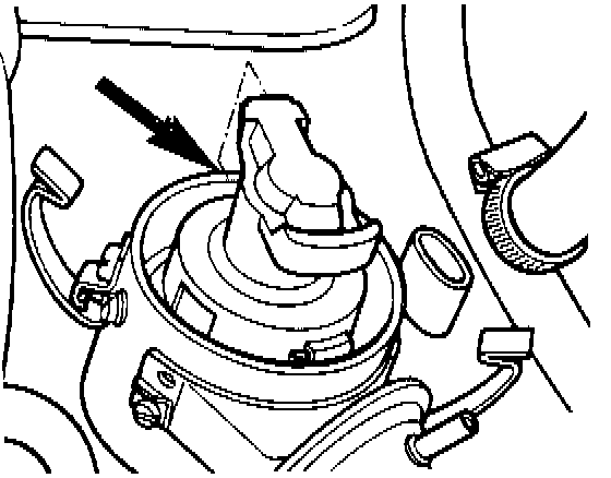 Fig. 5-5. Lug (arrow) on oil pump drive shaft aligned parallel to engine crankshaft.