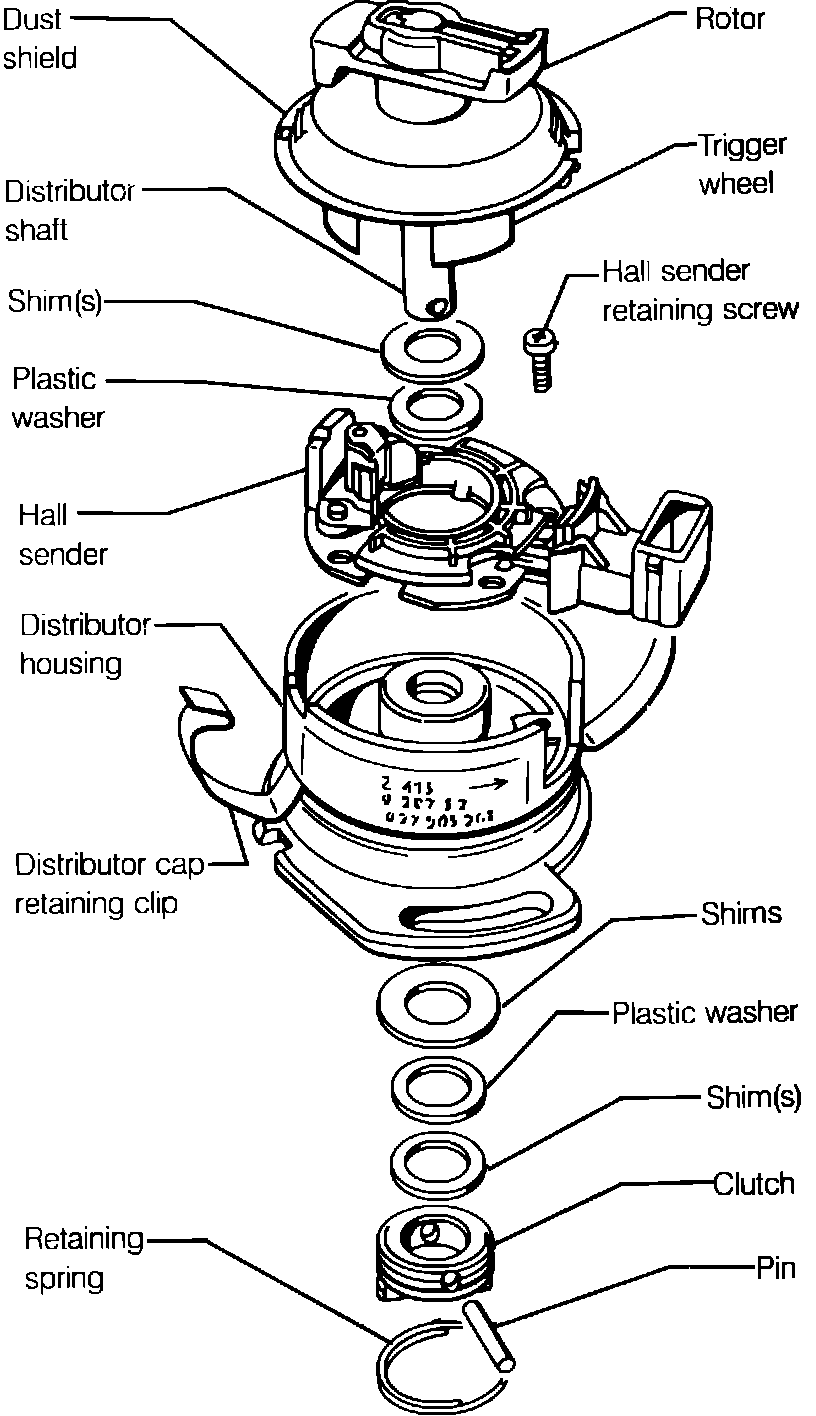 2. Pull the shaft, rotor, trigger wheel assembly out through the top of the distributor.