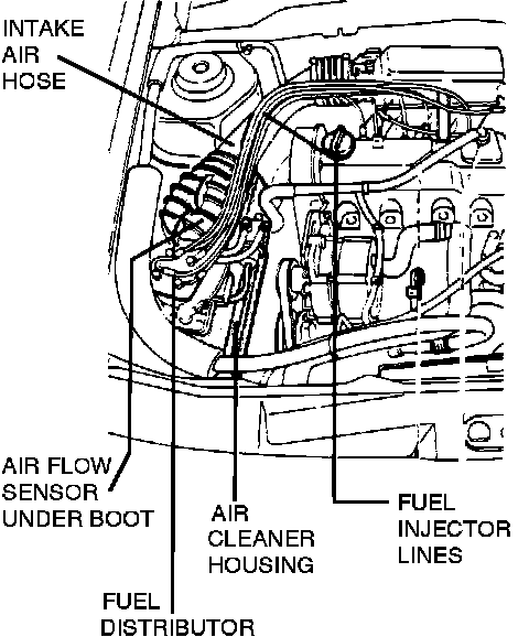 The Air Flow Sensor is located on the right side of the engine compartment just forward of the shock tower and below the black rubber intake air hose.