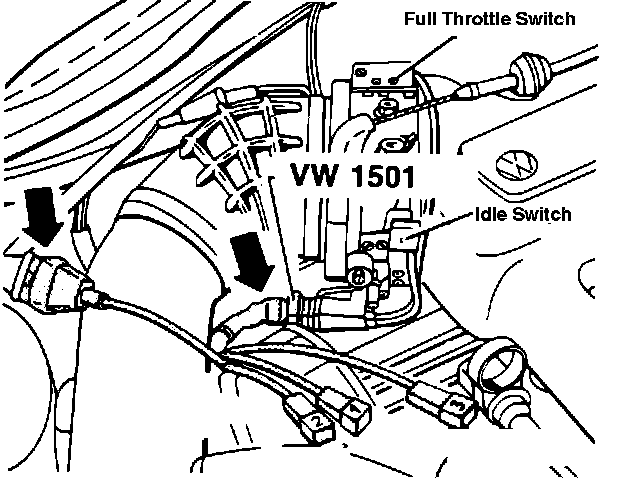 1. With the ignition "OFF", disconnect the throttle switch connector and connect special tool VW 1501 if available, between the harness connector and the throttle switch plug. If special tool VW 1501 is not available carefully probe the necessary terminals.