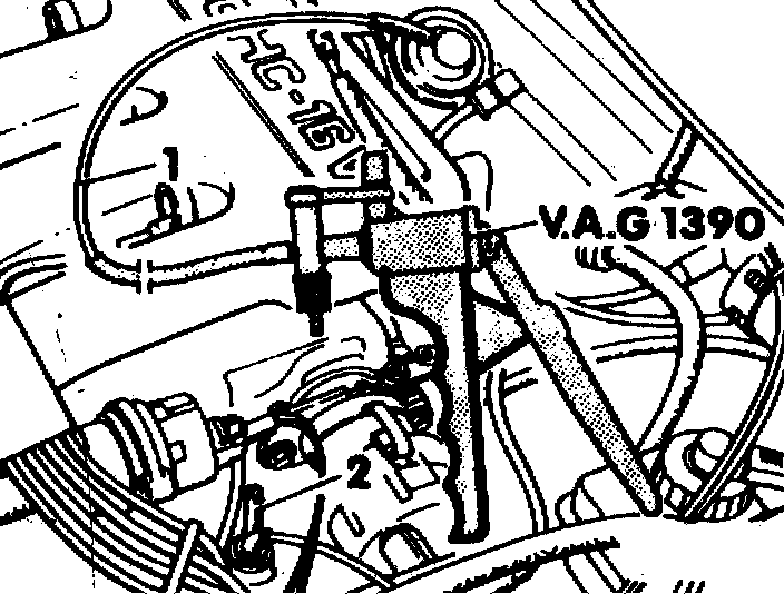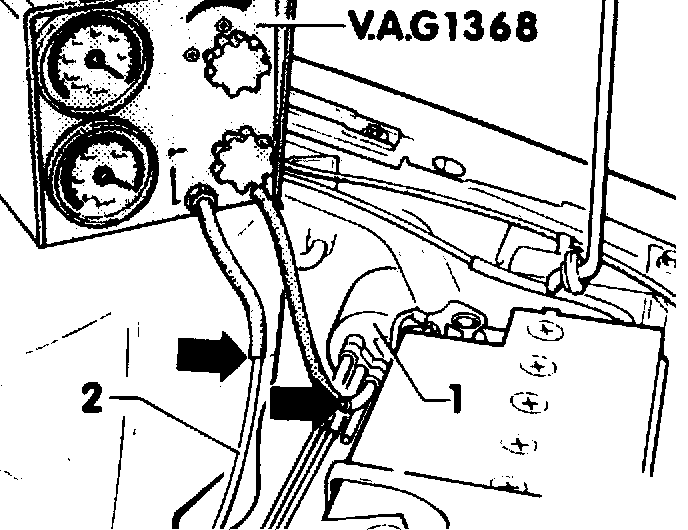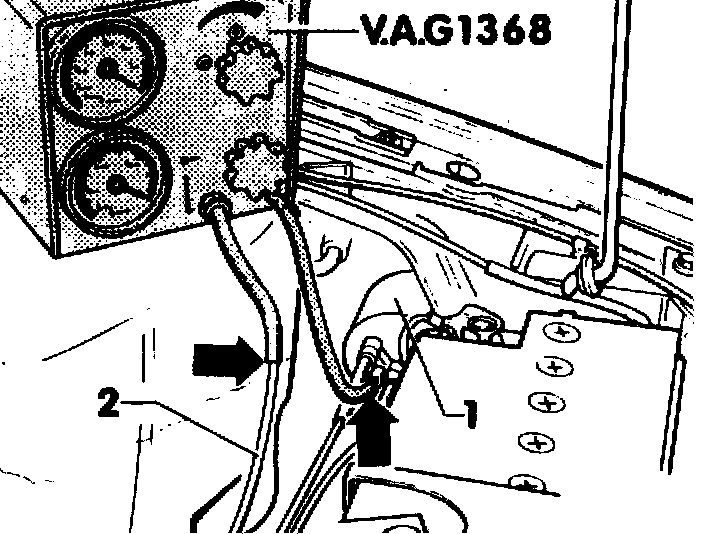 - Connect vacuum tester VAG 1368 between vacuum booster 1 and the red line to the throttle support 2