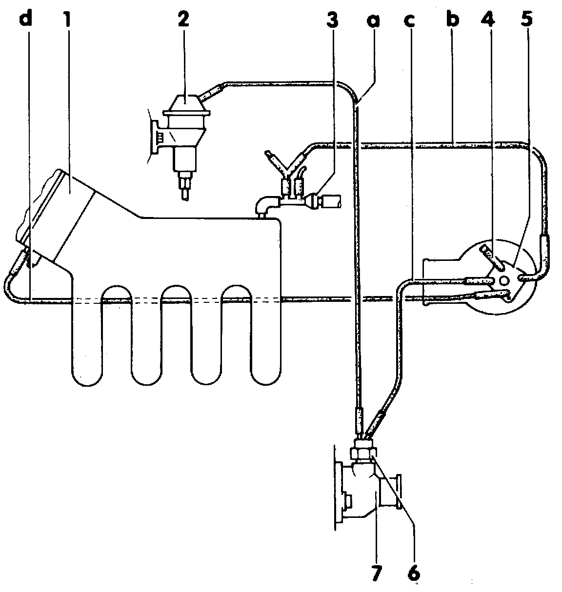 - Connect vacuum tester VAG 1368 between vacuum booster 1 and blue line to the Thermal Vacuum Valve (TVV) 2