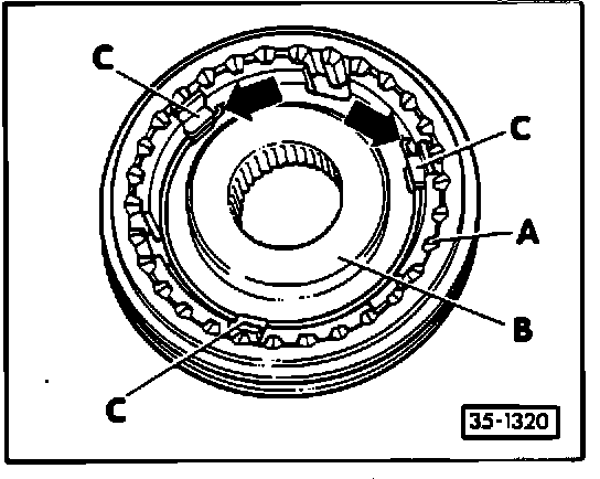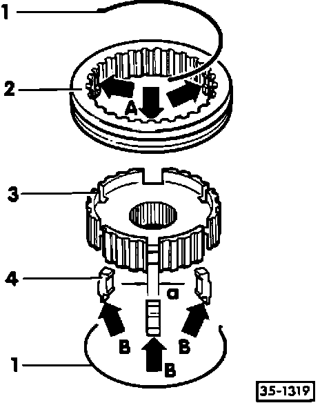 ^ installed position: smaller end (arrows B) toward edge of meshing teeth in synchronizer (item 2)