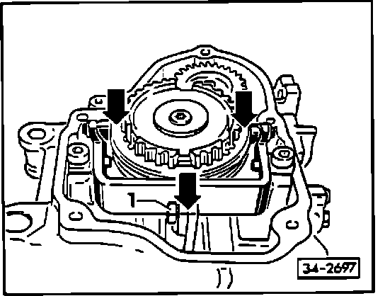 ^ install so that teeth (arrow 1) in synchronizer, and high collar of synchronizer hub (arrow 2) face transmission housing