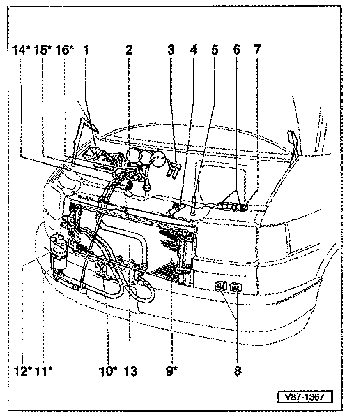 NOTE: System components identified with an * must only be serviced or replaced after discharging refrigerant system. Use recovery/recycling unit Kent Moore ACR3 or equivalent.