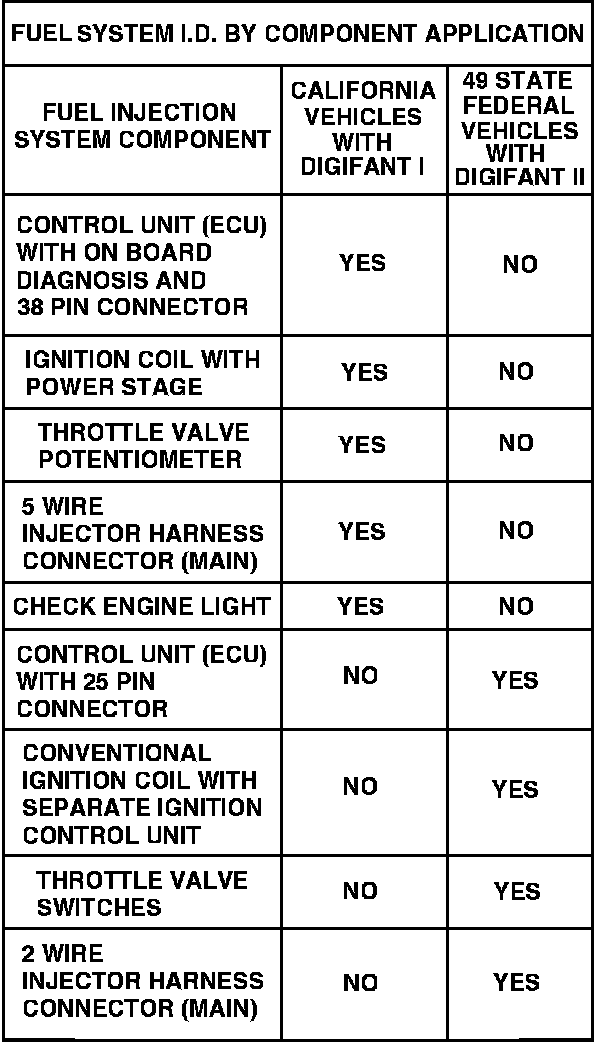 There are major differences in the two (2) fuel injection systems used on this vehicle, be sure you know which system you have before any work begins. Vehicles equipped with CALIFORNIA EMISSIONS have a significantly different fuel system than vehicles equipped with FEDERAL EMISSIONS. Because of this, the need to positively identify the vehicle's fuel system before work begins is very important. Adding confusion to the problem is the fact that, the engine I.D. code can not be used to properly identify the fuel system, (the engine I.D. code was used for fuel system I.D. in the past). The two different systems can be found on engines which have the same I.D. code, the systems look alike, but they are very different in terms of total system operation. Several testing and adjustment procedures are completely different as well. These two systems are DIGIFANT I (CALIFORNIA) and DIGIFANT II (FEDERAL). The two systems do share many components which are identical, but they also have components which are only compatible with the system for which they were designed.The biggest difference in these two systems is that all CALIFORNIA vehicles, (DIGIFANT I) have an ON BOARD DIAGNOSIS (OBD) system as required by the California Air Resources Board. The OBD system is incorporated into the DIGIFANT I control unit (ECU). The OBD system is designed to detect malfunctions in the fuel metering system which may cause the vehicle to fail an exhaust emission test. If the OBD system detects a fault within the fuel system, it illuminates a dash warning light informing the driver that a malfunction has developed. The Digifant I control unit (ECU) has permanent fault memory capability which will receive and store the malfunction information as fault codes. The fault codes can be recalled from the ECU then used for diagnosing the malfunction, refer to DIAGNOSIS AND TESTING PROCEDURES for more information. The FEDERAL vehicles, (DIGIFANT II) do not have ON BOARD DIAGNOSIS.
