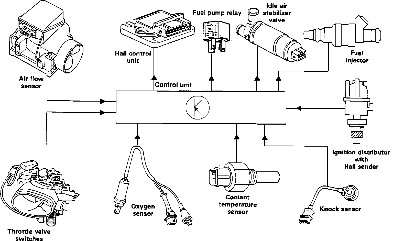 The Digifant II control unit, which is located at the left rear of the engine compartment, is responsible for management of the fuel injection, ignition, and idle speed systems. It receives and evaluates information provided by various sensors concerning engine operating conditions. Input signals to the Digifant II control unit include: