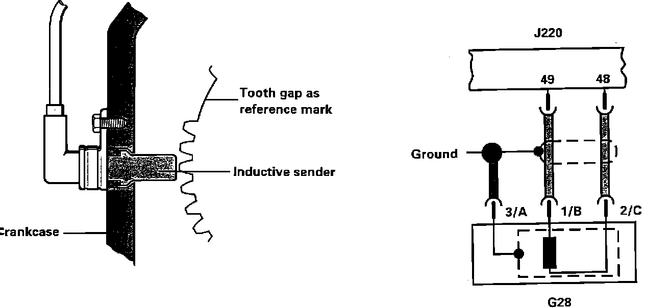 Voltage is induced in the sensor as each tooth on the gearwheel passes the tip. The gearwheel uses a two-tooth gap to indicate crankshaft position.