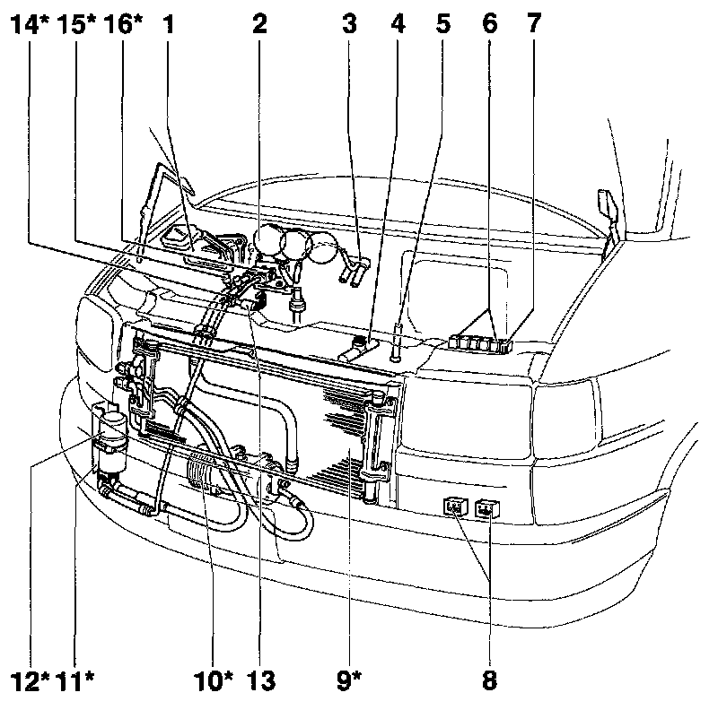A/C refrigerant (R-1 34a) and heating system, components in engine compartment1. Air intake duct, rear