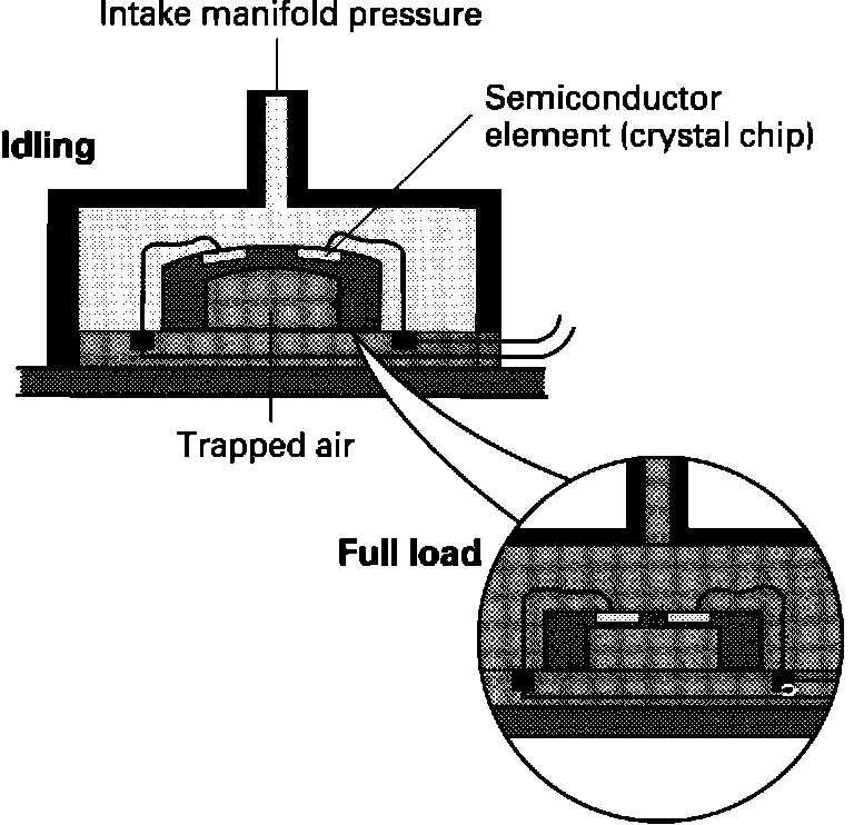 The flexing of the chip causes the semiconductors to alter their shape. This changes the resistance values of the semiconductors. This change in resistance is used by the Digifant control module to determine engine load.