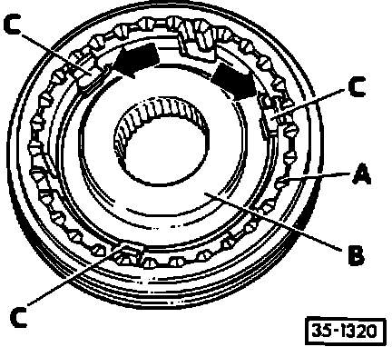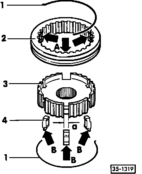 ^ installed position: smaller end (arrows B) toward edge of meshing teeth in synchronizer (item 2)