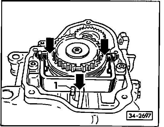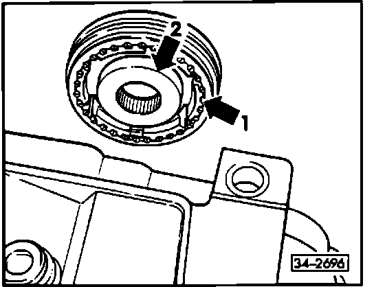 - install so that teeth (arrow 1) in synchronizer, and high collar of synchronizer hub (arrow 2) face transmission housing