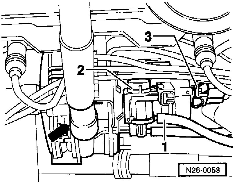 - Disconnect vacuum hose -1- from Secondary Air Injection solenoid valve -2- (N112).
