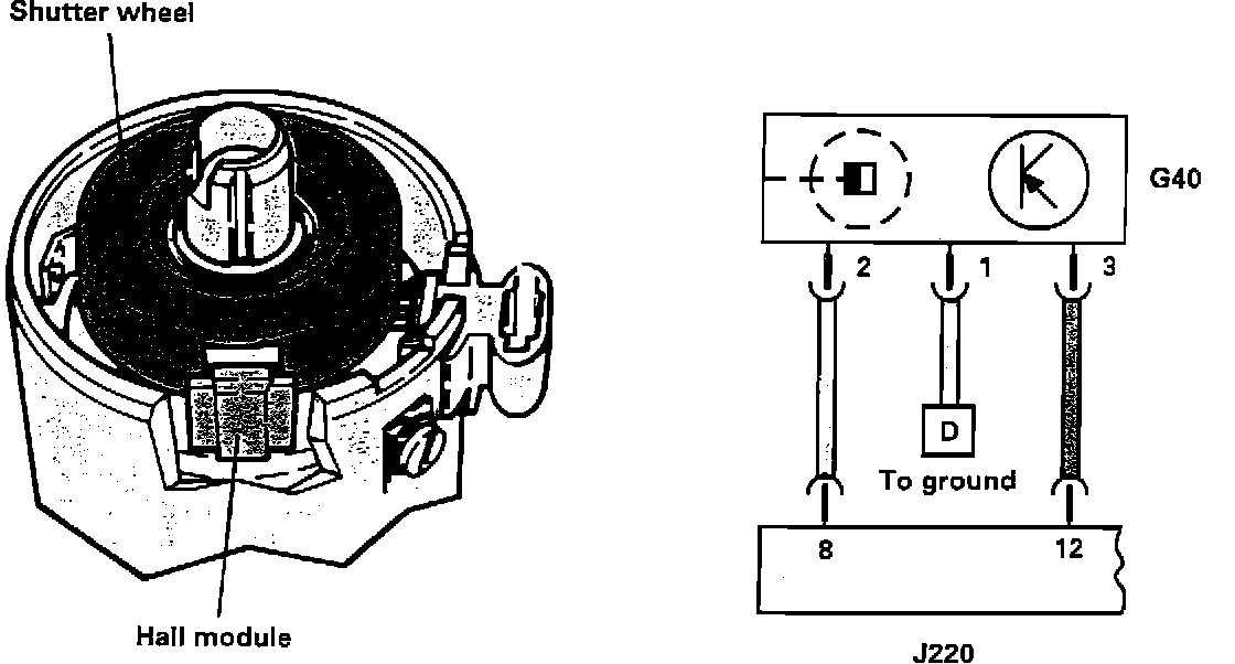 A voltage signal is generated when the shutter wheel interrupts the magnetic field of the IC. Since the shutter turns at camshaft speed, one signal is generated for every two crankshaft revolutions.