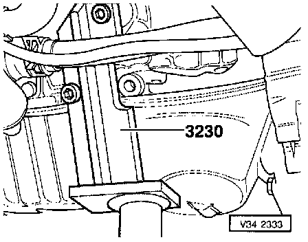 - Move VAG 1383 A jack with transmission mount 3282 under transmission and support it.