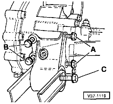 - Remove all bolts (A, B and C) and remove bonded rubber mounting.