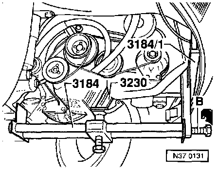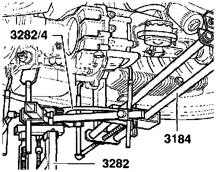 - Secure 3184 removal device to subframe -A- and to auxiliary support 3184/1 by tightening angle plates.