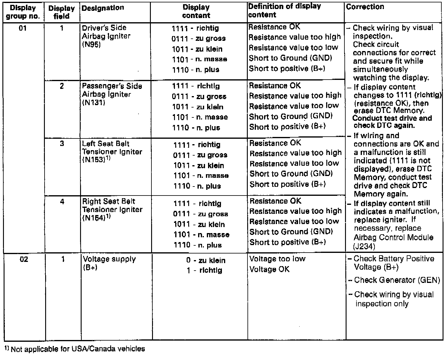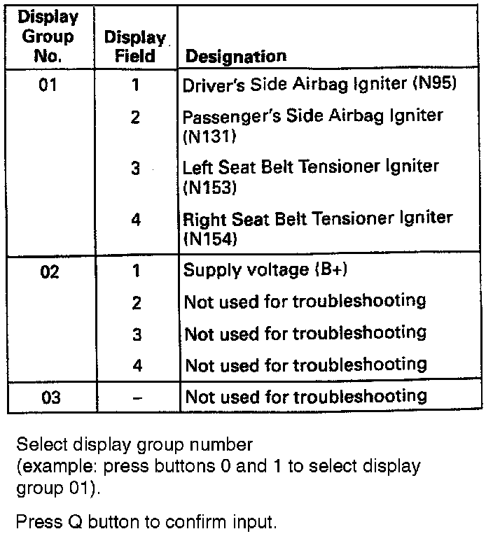 Three measuring value block display groups each have four display fields that can be read. For troubleshooting however, only the data in display group 1 and in display field 1 of display group 2 are used.