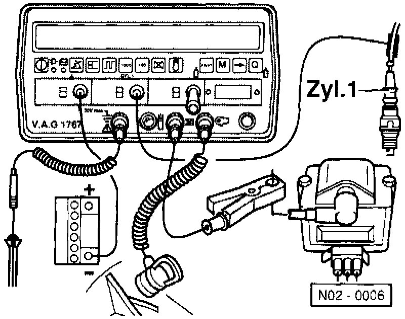- Connect VAG 1367 Engine Tester using the VAG 1367/8 inductive pickup.