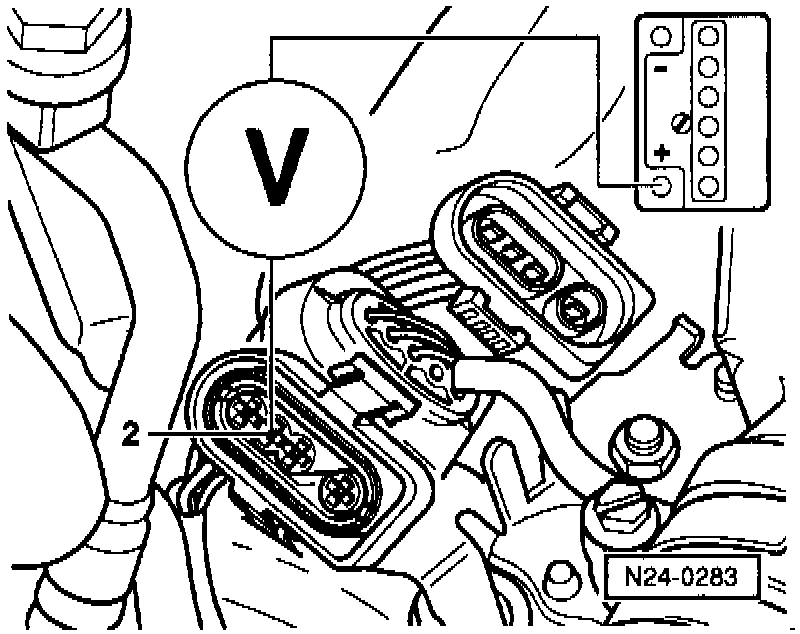 - Connect multimeter using test leads from VW 1594 to ECM connector terminal 2 and battery positive (B+).