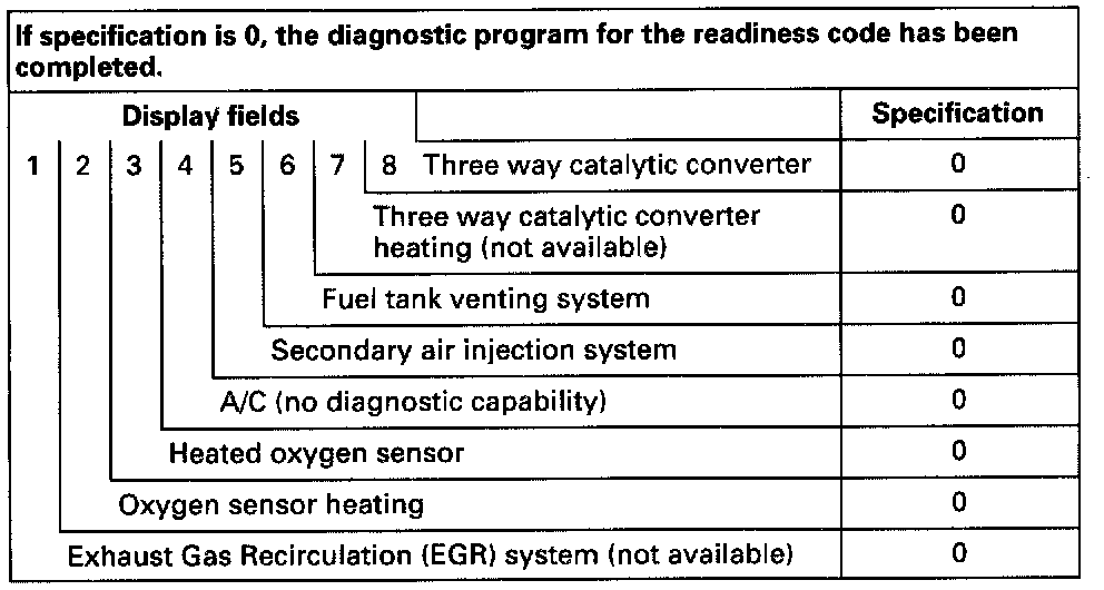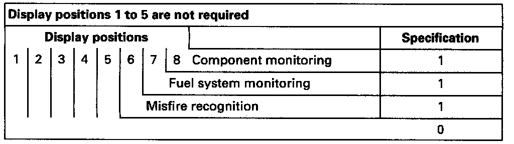 If the specification is not obtained in display field 4 and a 1 is displayed, then the appropriate diagnostic sequence has not yet been performed. The readiness code must still be created. [1][2]Monitors, Trips, Drive Cycles and Readiness Codes