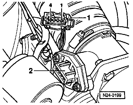- Connect multimeter with test leads from VW 1594 to measure voltage at terminals 1 and 3.