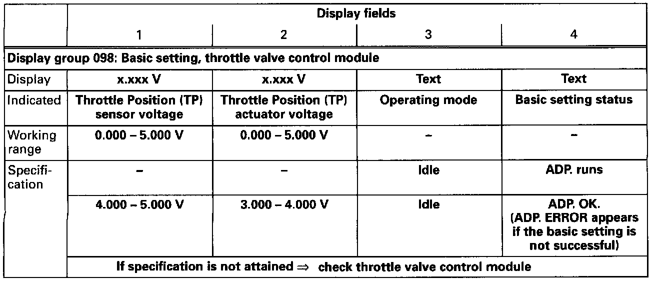 NOTE: After confirming the display group 098 the Throttle Position (TP) actuator will be moved to the min., max. and then into the start position. The control module stores the appropriate throttle valve angle in the permanent memory. The throttle valve will then remain in the start position.