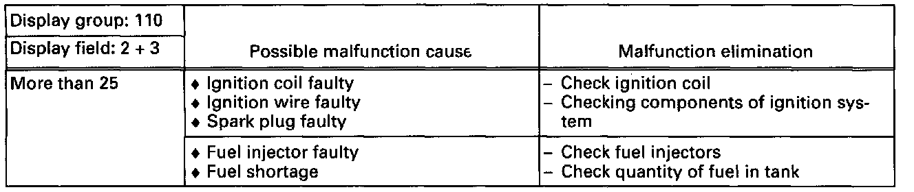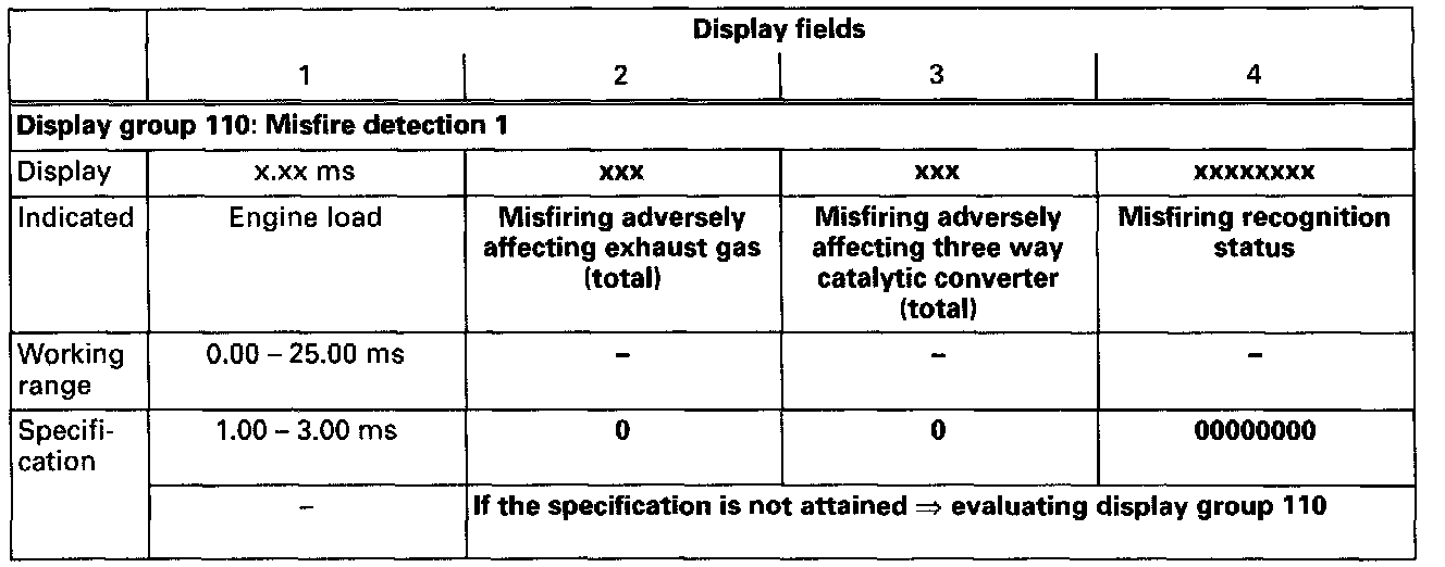 - Check the specifications for misfire detection (display fields 2-4).