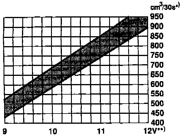 NOTE: Fuel pump output varies depending on the voltage at the pump. Always measure the voltage at the pump (with the pump running) before using the chart shown above. In general, pump voltage is 1-2 volts less than battery voltage.