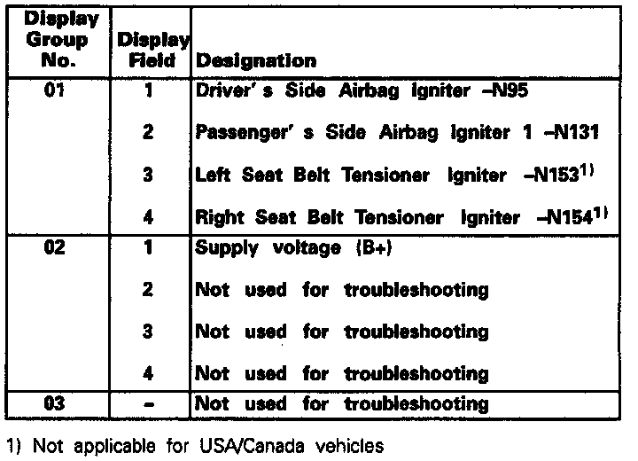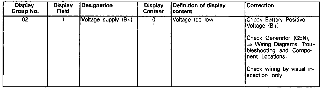 Overview:Three measuring value block display groups each have four display fields that can be read. For troubleshooting, however, only the data in display group 1 and in display field 1 of display group 2 are used.