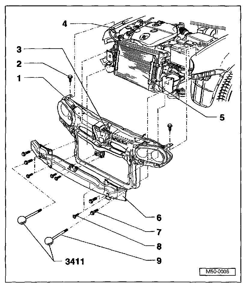 - Remove one bolt each at longmembers and screw in Guide rods 3411 at right and left longmembers.