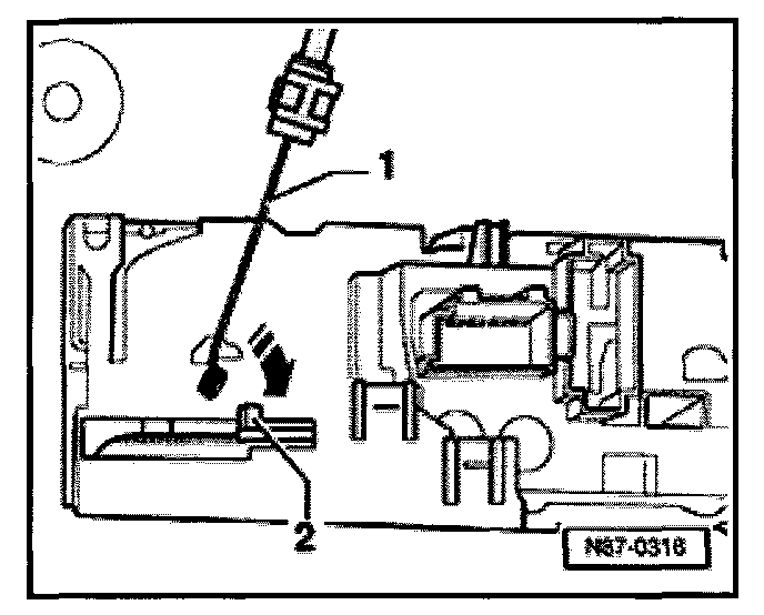 - Hold cable end -1- at an angle and press onto control lever -2-, -arrow-.
