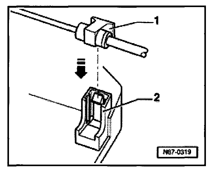 - Insert footwell/defrost flap cable, temperature flap cable, temperature flap cable and central flap cable -1- into clip -2- and press in to stop.
