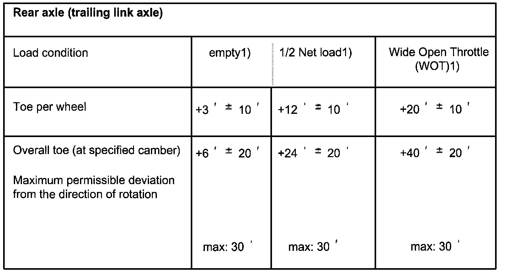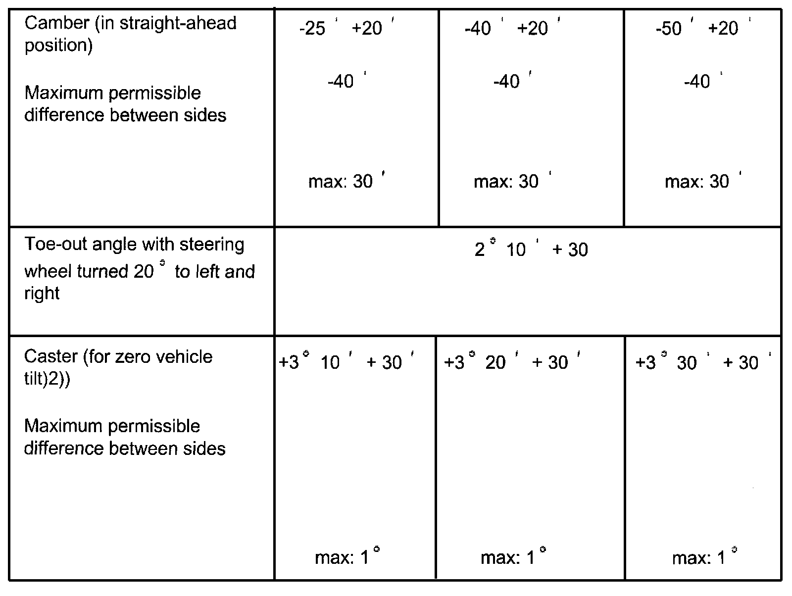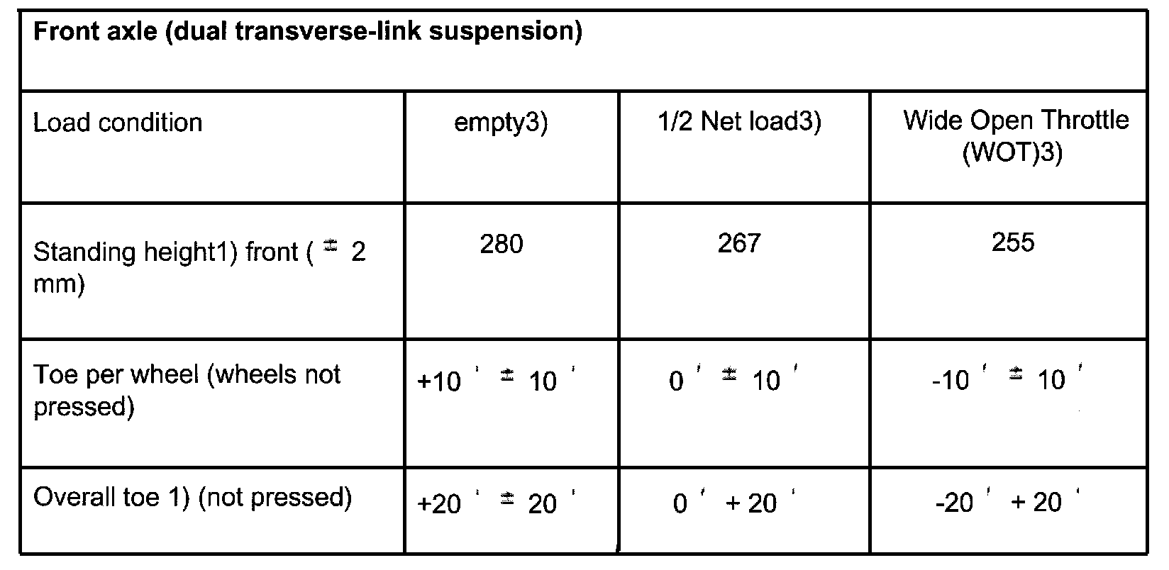 1) If vehicle height (ride height) has to be adjusted, the front axle alignment should be checked in full. After adjusting the vehicle height, push vehicle forwards and backwards over approx. 2m, then re-check height.