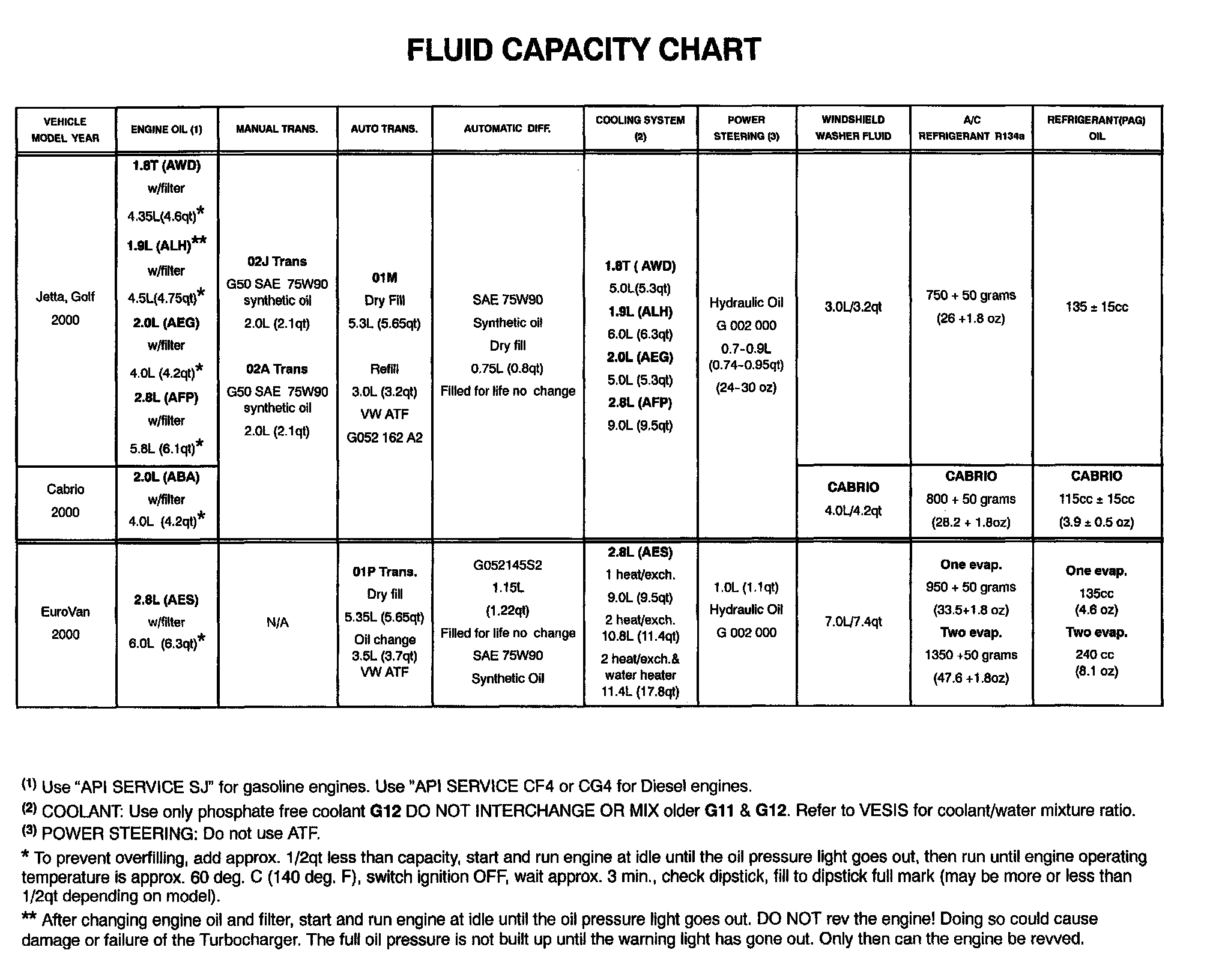 The following fluid capacity chart applies to 2000 model year vehicles.