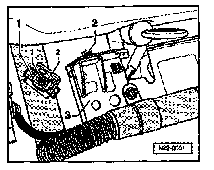 - Disconnect connector -1 - from solenoid valve -2- and connect the VAG 1527B voltage tester to disconnected connector using VAG1594 connector test kit.