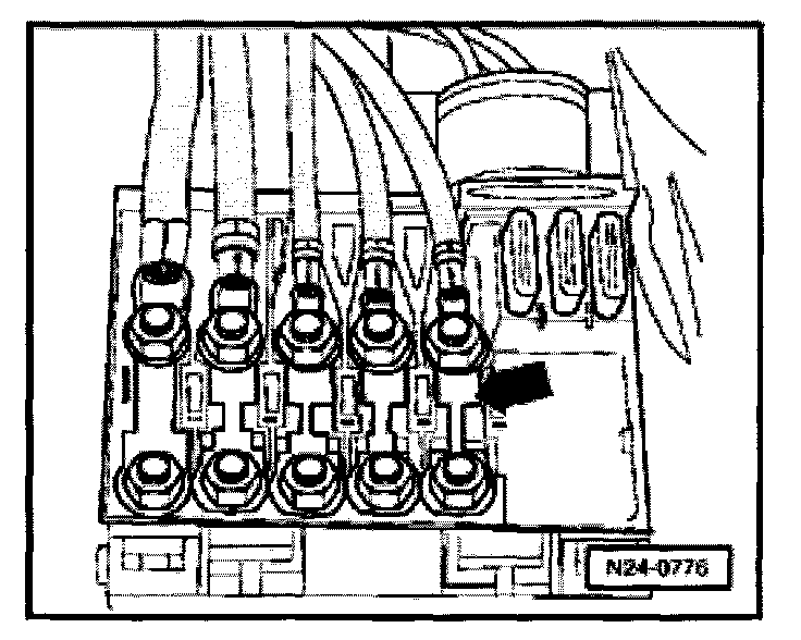 - Use auxiliary wires from VAG 1594 to connect VAG 1527B voltage tester to terminals 3 and 4 of the relay carrier.