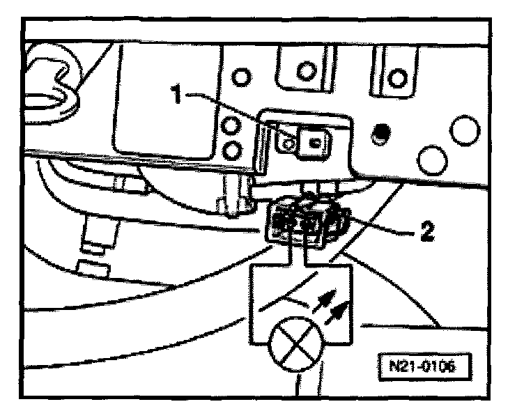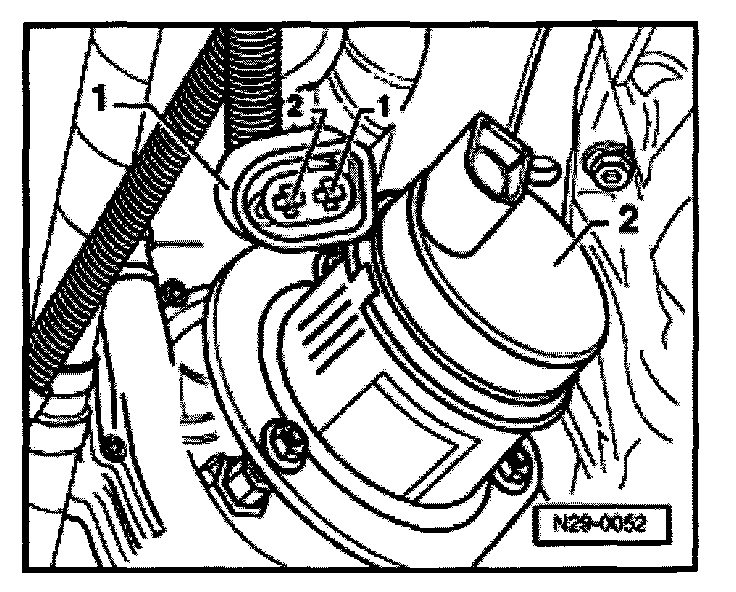 - Disconnect connector -1- from solenoid valve -2- and connect the VAG 1527B voltage tester to disconnected connector using VAG1594 connector test kit.