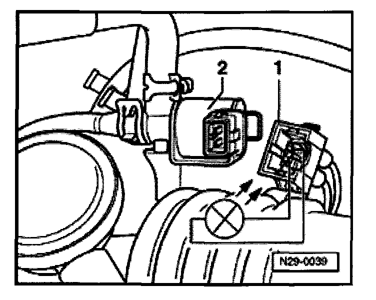 - Disconnect 2-pin connector -1- from Secondary Air Injection (AIR) pump motor -2- and connect the VAG1527B voltage tester to disconnected connector using VAG1594 connector test kit.